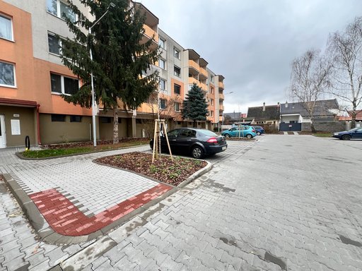 Rekonstrukce parkovacích ploch u panelového domu a mateřské školy v ulici za Radnicí ve Starém Městě. Součástí zakázky byly takové přístupové chodníky a schodiště k mateřské školce a dětské hřiště.